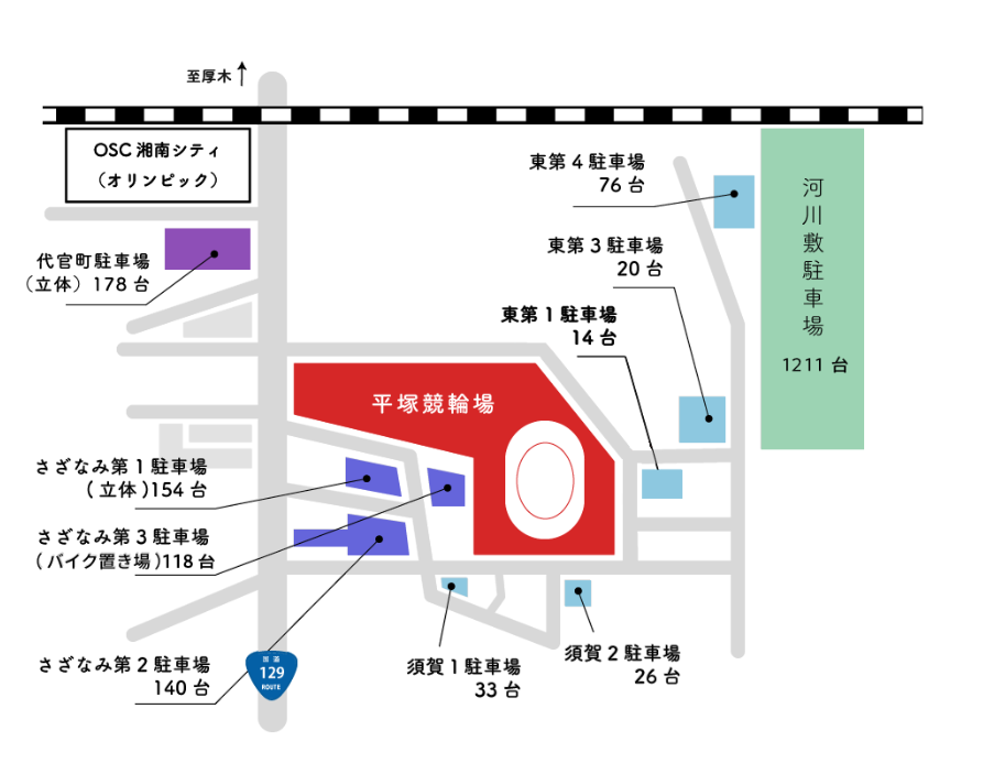 ※平塚競輪場の駐車場はすべて無料ですが、台数の少ない駐車場から順番に満車になります。特にさざなみ第1駐車場や東第1駐車場は早朝から埋まる傾向があるため注意が必要です。